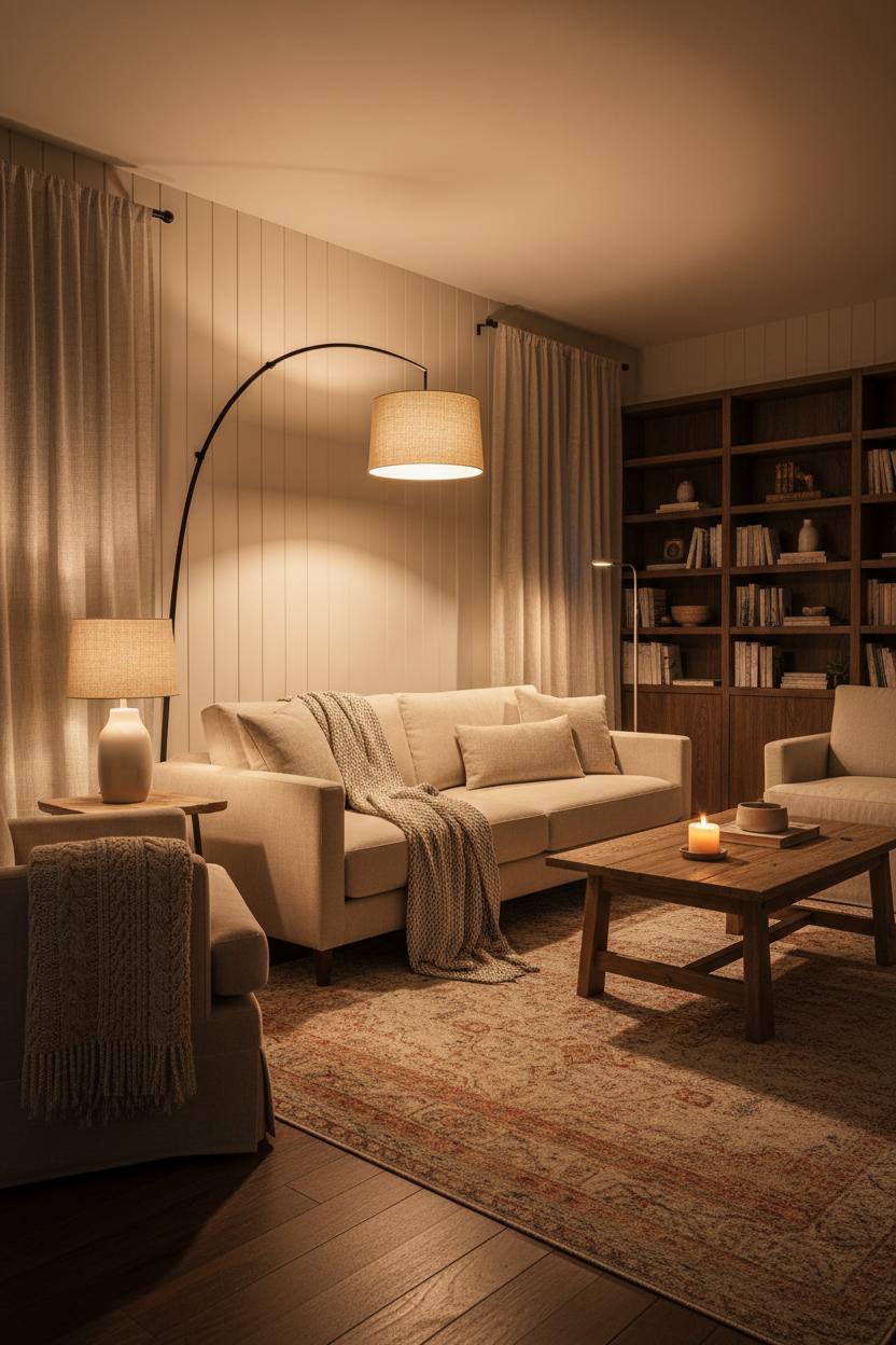 Corners love light, so slip a slim LED floor lamp 2–3 feet from the corner to prevent heavy shadows and let it graze the drapery; the glow will highlight texture and make your ceiling feel taller. If your vibe leans modern farmhouse, try a black-metal arc lamp with a linen shade arcing over the wood coffee table—rustic meets refined—and balance the look with neutral throw blankets tossed over the sofa for that casual, collected feel. Two lamps can work beautifully, too: place one to the left of the sofa and another across the room by a bookshelf for an easy, balanced conversation between light sources. Use dimmers or smart plugs so you can dial light down for evening coziness and up for weekend chores. Be mindful of cord management; run cords along baseboards or under the area rug plush with a proper rug pad so pathways stay clear. For a final touch, angle an adjustable head to skim artwork or a textured wall—just enough to catch the grain and deepen those earthy tones—so your cozy decor ideas feel intentional, layered, and lived-in.