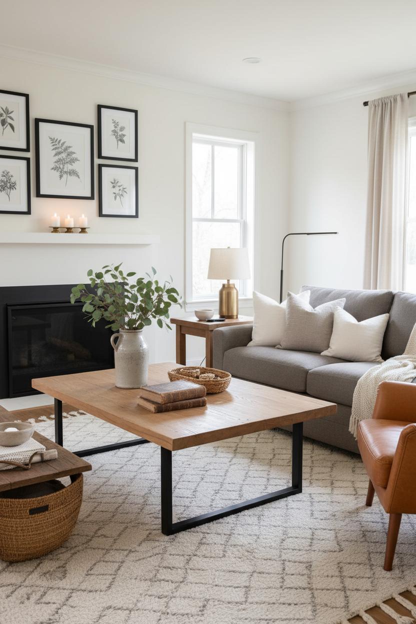 When rustic woods meet clean lines, the look lands right in that modern farmhouse sweet spot—inviting, unfussy, and beautifully balanced. Start with a foundation of earthy tones: think creamy whites, soft mushroom, and warm caramel layered over matte black or iron accents. A solid wood coffee table with simple, squared-off legs grounds the space and gives you a hardworking surface for books, baskets, and fresh stems in a stoneware jug. Underfoot, choose an area rug plush enough to sink your toes into; a low-contrast pattern keeps things calm while adding interest. Then pile on neutral throw blankets in linen, cotton, or chunky knits for that “come sit a while” warmth that defines a truly warm living room. The silhouette of the furniture stays clean—tailored sofa, streamlined side chairs—while textures do the heavy lifting, from reclaimed wood and woven seagrass to crisp canvas and buttery leather.