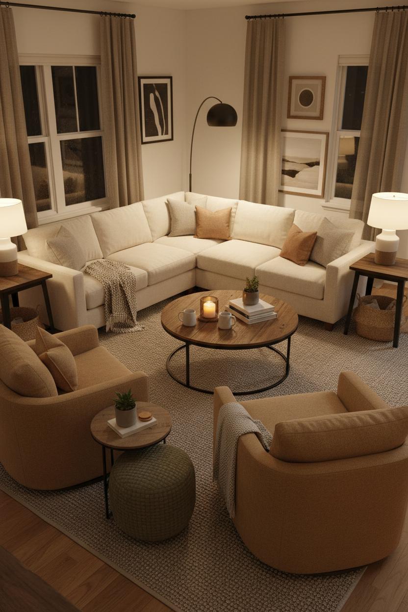 If your space is open concept, carve out multiple conversation spots that still feel connected: a fireside chat corner, a window perch for morning coffee, and a main sofa zone for movie nights. Use smaller rugs to map each area, repeating the same palette of earthy tones to tie it all together. Keep the light low and flattering with layered lighting on dimmers—let an LED floor lamp arc light into a dark corner while table lamps bring a warm glow across faces. Finish with a candle set unscented for dinner-party nights and the textural coziness of neutral throw blankets; it’s a simple suite of cozy decor ideas that makes every gathering feel intimate.