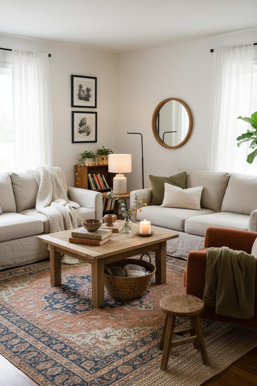 When you’re craving a warm living room without a full makeover, start with texture and tone. Swap in pillow covers you love and toss a couple of neutral throw blankets over the sofa and armchair—one neatly folded, one casually draped for that effortless, collected feel. Underfoot, an area rug plush enough to sink your toes into instantly grounds the room and makes even budget seating feel luxe; try layering a vintage flatweave over a larger jute for dimension. Keep your palette rooted in earthy tones—think clay, oat, olive, and rust—so every piece plays nicely together and feels mellow from morning coffee to late-night movie marathons. A few woven baskets corral remotes and extra textiles, while a simple tray turns everyday items into a styled moment on the coffee table.