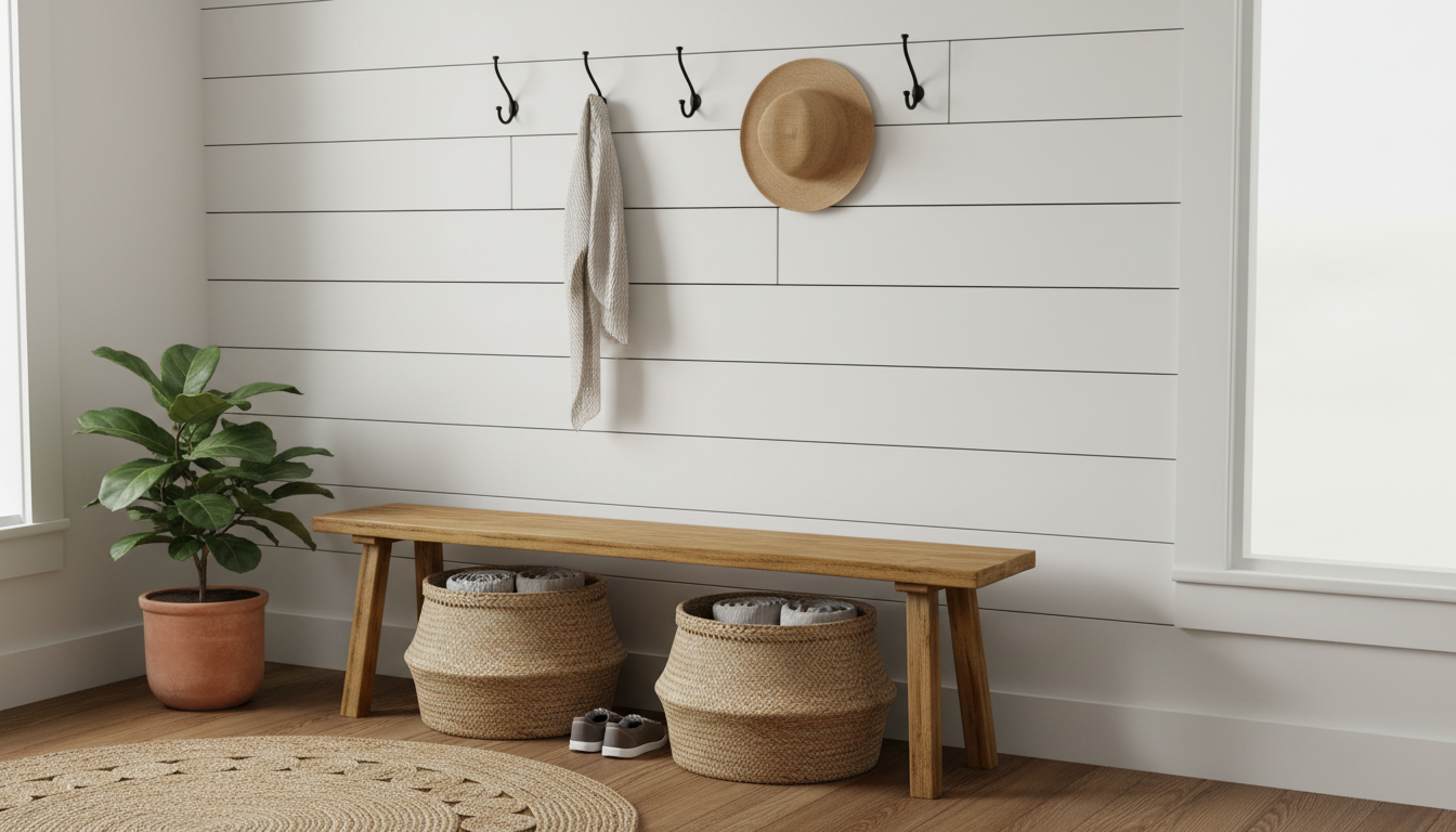 Finish the entryway makeover with hardworking, beautiful details. A row of matte-black wall hooks under a narrow shelf keeps daily grab-and-go essentials handy, and woven storage baskets tucked beneath a bench corral scarves, dog leashes, and mail without visual clutter. Layer in a natural-fiber rug, a round mirror to bounce light, and a small potted plant to soften the lines of the shiplap. In just an afternoon, you’ll have a feature wall that feels intentional and elevated—proof that peel and stick shiplap can completely transform a tight entry without drywall dust, big tools, or big spend. This is small space decor that works hard and looks even better.