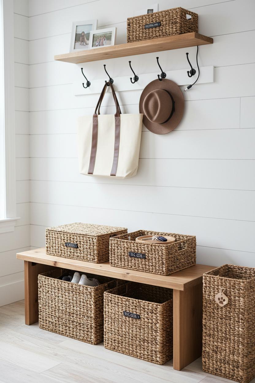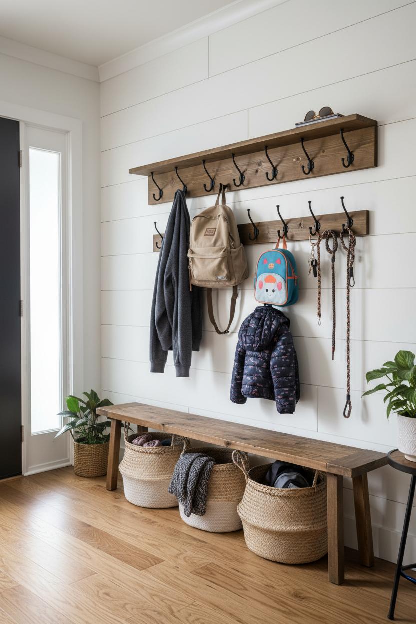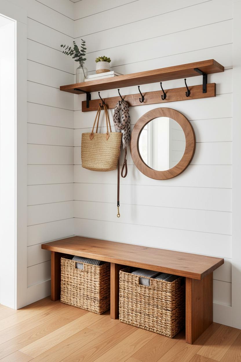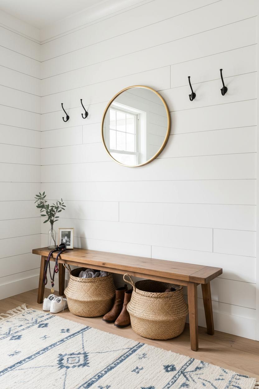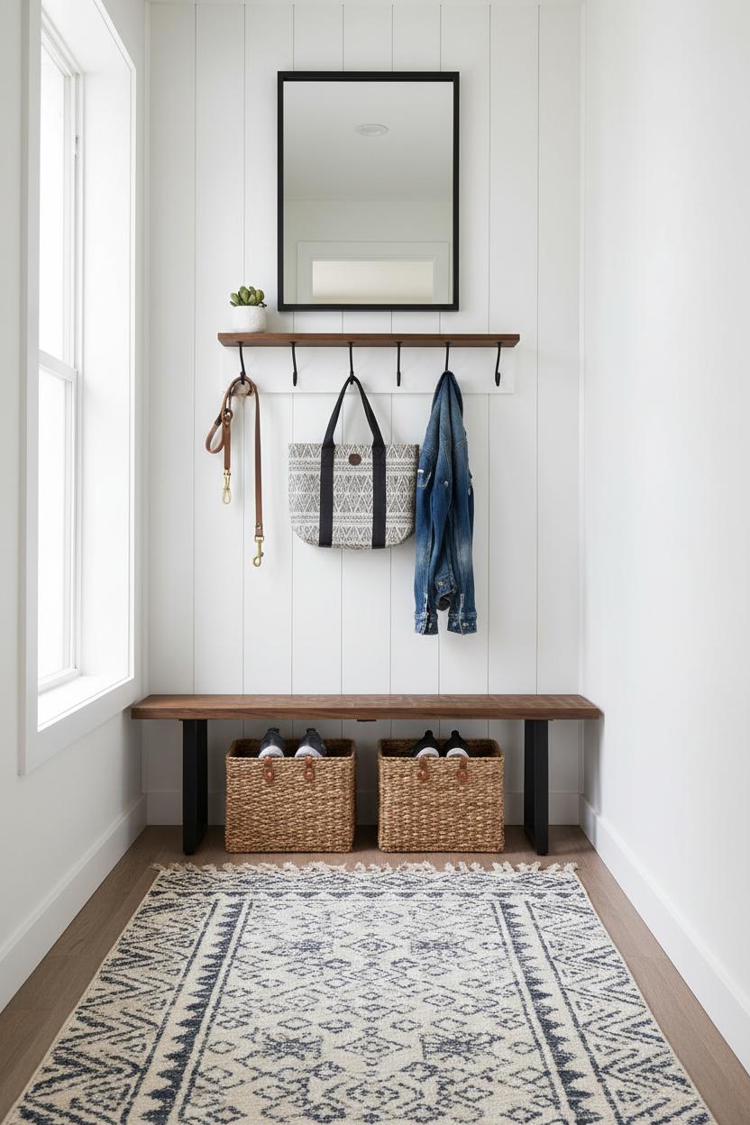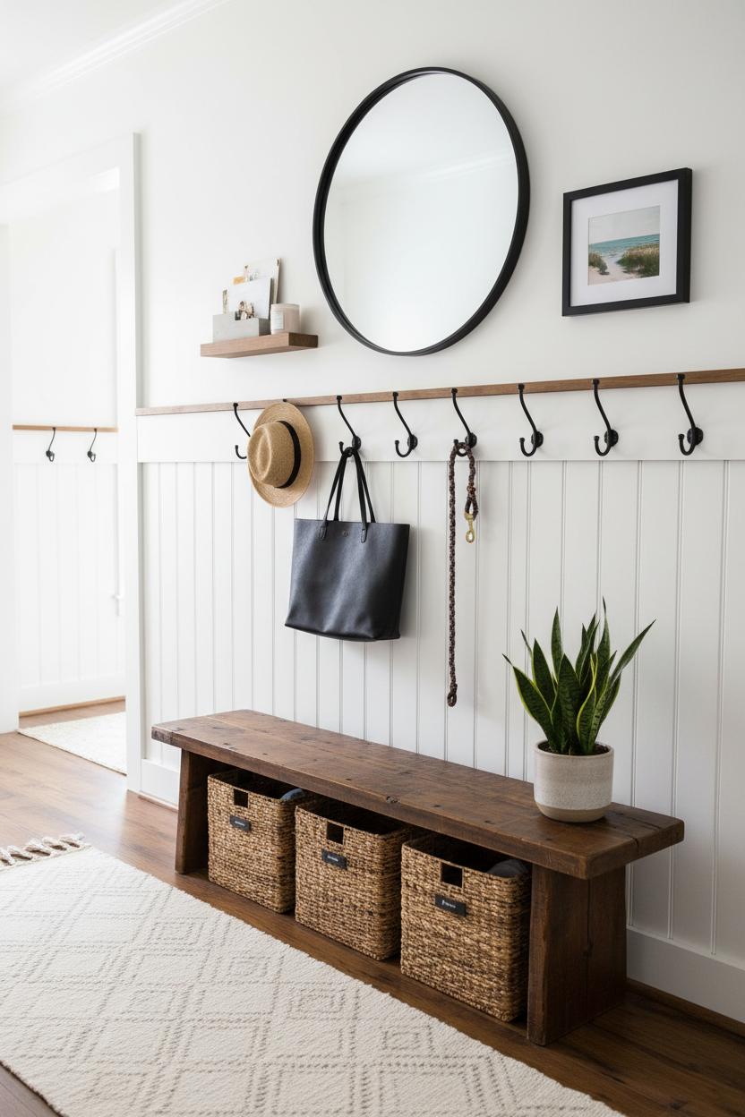 Once the bones are in place, layer in storage that looks intentional. Slide woven storage baskets under the bench to corral shoes and scarves, then anchor a row of wall hooks above for bags, hats, and dog leashes. Mounting is fast with a cordless drill and a level; stagger the hooks so they double as art. If you’re tight on square footage, lean into small space decor tricks: a slim floating shelf for mail, a narrow runner to guide the eye forward, and a mirror to bounce light and make your landing zone feel airier. Keep the palette tight—think crisp white shiplap, warm wood tones, matte black hardware—so everything reads cohesive and calm the moment you step inside.