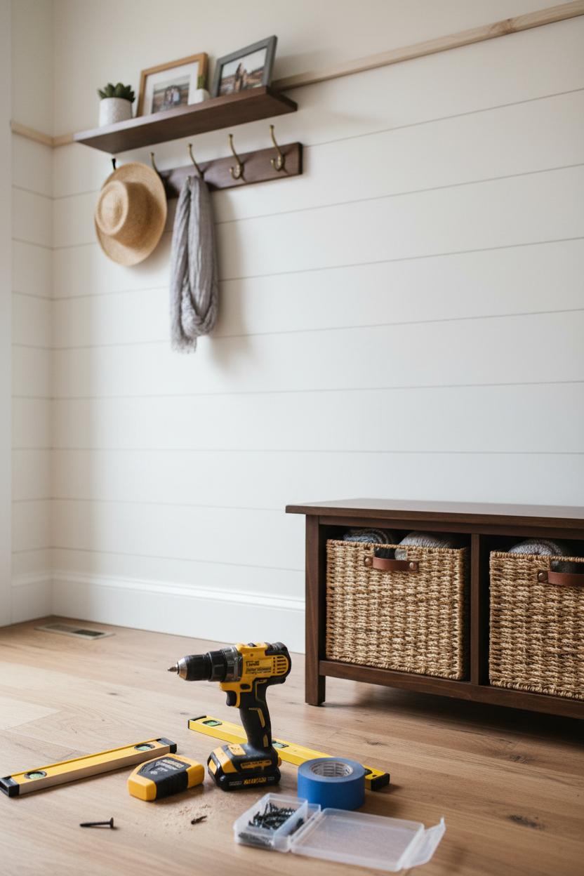 When you’re working with a tight budget and an even tighter foyer, aim for a few pieces that deliver major visual payoff. Start by creating a focal wall—peel and stick shiplap is the hero of this entryway makeover. It goes up in an afternoon, adds instant texture, and is forgiving if your walls aren’t perfect. Try running the boards vertically to stretch the room or cap half the wall for that cozy cottage vibe. Balance the fresh lines with something warm and lived-in: a simple thrifted bench revived with a quick coat of wood stain. It’s the kind of home diy that feels custom without the custom price tag, and it’s exactly the kind of project that makes weekend projects feel so satisfying.