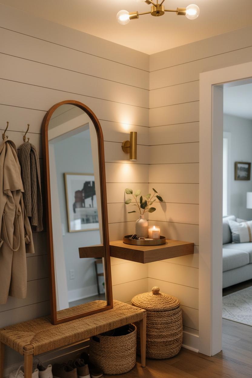 Once the bones are mapped, layer in small space decor that works as hard as it looks good. A vertical accent like peel and stick shiplap instantly defines the zone, adds texture, and protects scuff-prone walls—no sawdust, just measure, trim, and press. Pop a mirror above a narrow wall-mounted ledge to bounce light and create that airy, Pinteresty feel. Stagger a row of wall hooks for coats, dog leashes, and totes, then corral the daily drop with woven storage baskets tucked beneath a slim bench. If you’ve thrifted a board for the seat, a quick coat of wood stain ties your tones together and upgrades it from “found” to “finished.” Keep hardware petite but sturdy, space hooks evenly so bags don’t tangle, and choose a runner that fits the taped outline you tested earlier. Little choices—like repeating one metal finish and two wood tones—make even a tiny entry feel intentional.